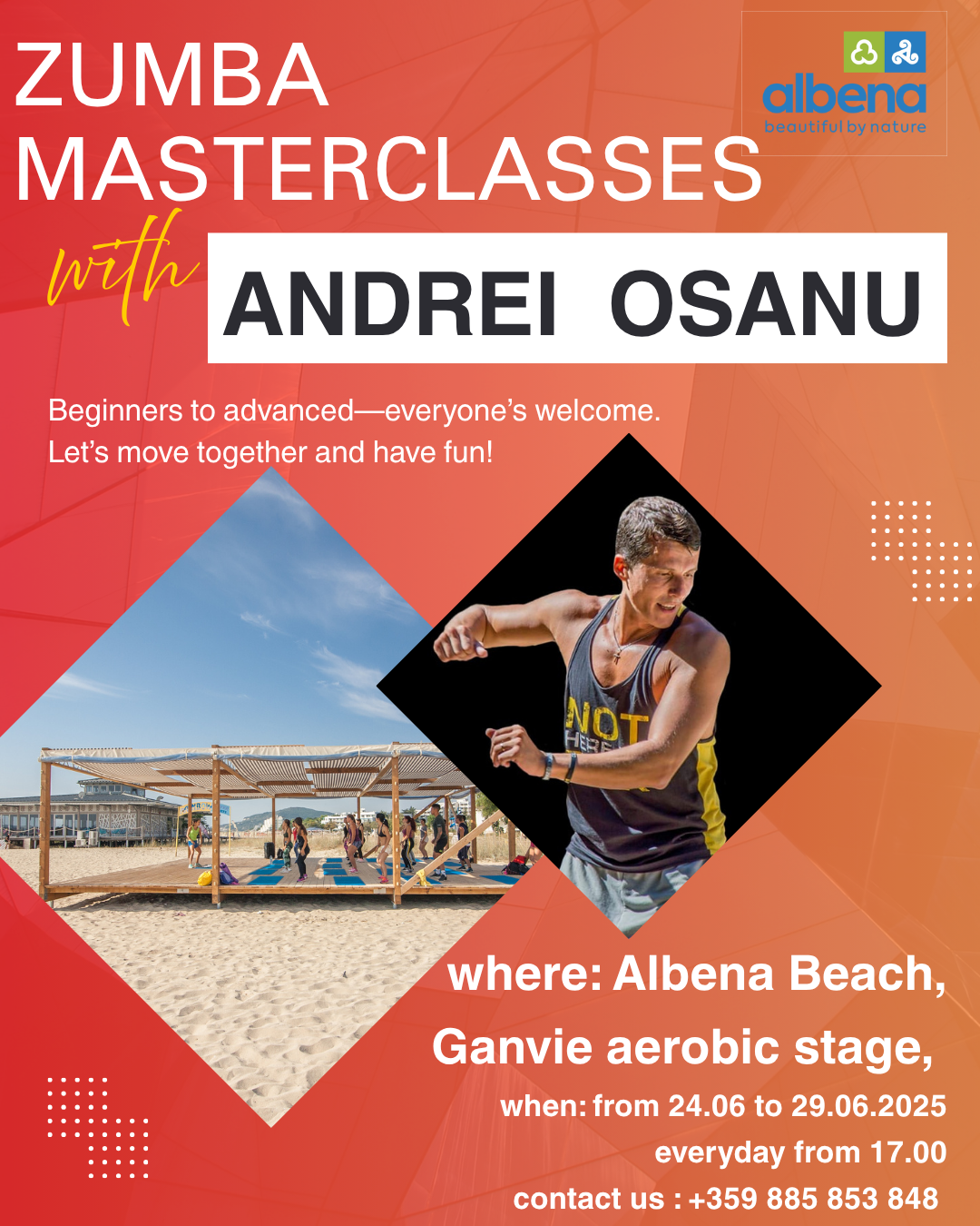В рамките на специалната програма на Албена за активен летен туризъм, Андрей Осану ще води ежедневни Zumba класове в периода 24 – 29 юни 2025 г. всеки ден от 17:00 часа. на аеробик сцената в зоната Ганвие, като са свободно достъпни и безплатни за всички гости на курорта.