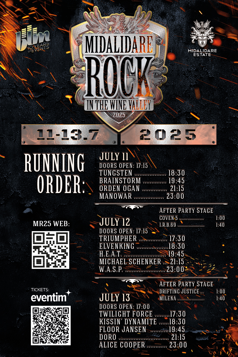 През 2025-а година Midalidare Rock In The Wine Valley ще се проведе от 11 юли (петък) до 13 юли (неделя). Хедлайнер в първия ден на фестивала са MANOWAR, които ще видим на 11 юли, петък. В събота, 12 юли хедлайнер са W.A.S.P., а в последния ден, неделя ще видим ALICE COOPER, както и DORO.