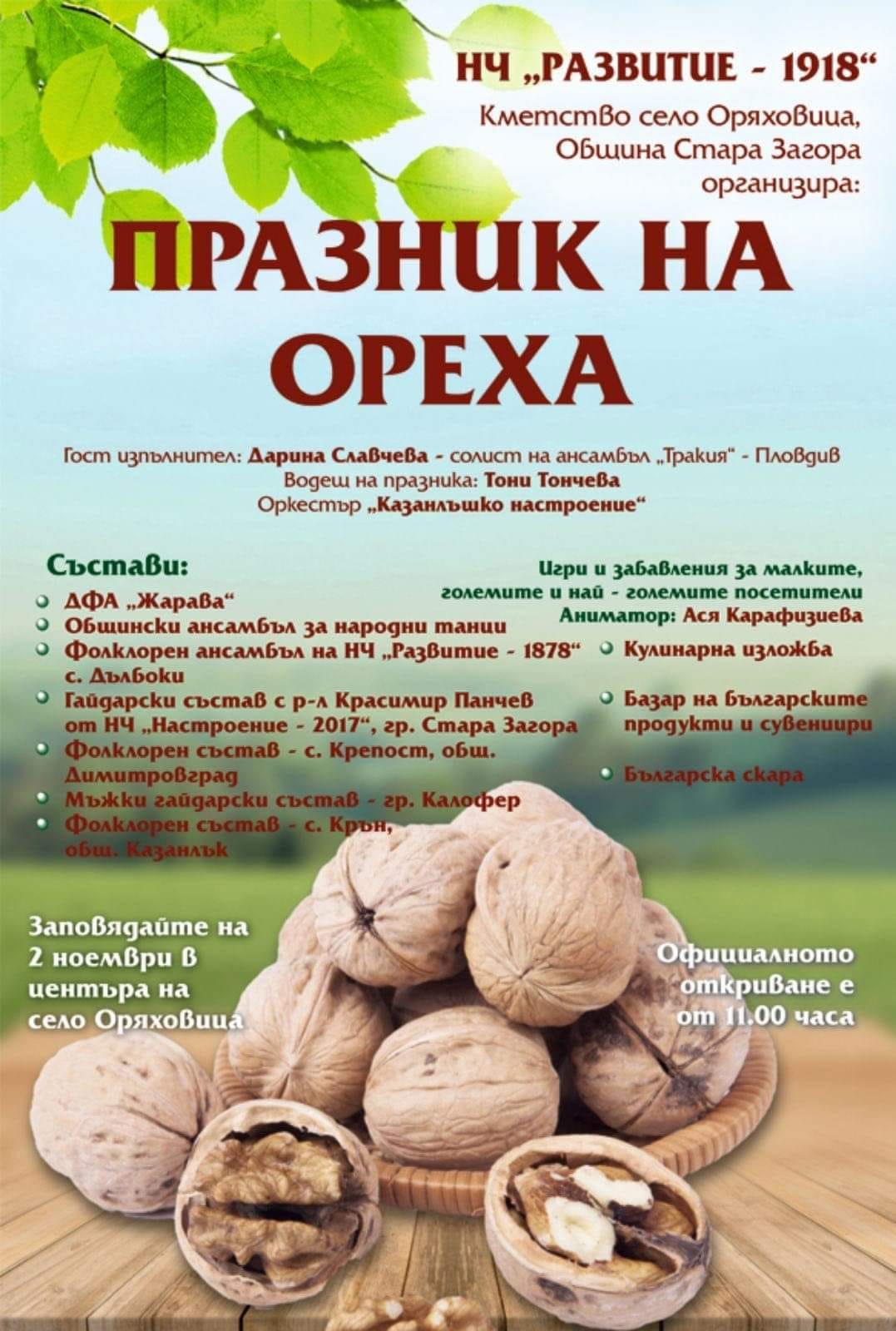 Началото на празника е от 11.00 часа на 2 ноември. Организатори са Община Стара Загора, кметство Оряховица и НЧ "Развитие - 1918".